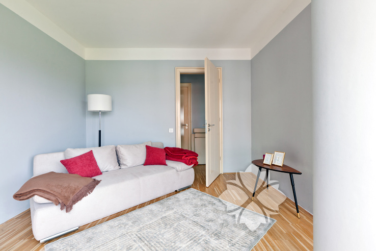 Dvouložnicový byt o velikosti 120 m2 s dvěma terasami byl designován a dekorován pro majitele, který byt využívá při jeho návštěvách Prahy, s možností jeho dalšího pronájmu v budoucnu. Cílem bylo splnit očekávání klienta, který často cestuje, využívá nemovitost jen občas, ale přitom vyžaduje komfort. Byt potřeboval nutné opravy popraskaných stropů. Abychom docílili osvěžení bytu po nájemci použili jsme nový benátský štuk v obou koupelnách v odstínech světle zelené barvy. Do kuchyňské linky jsme nainstalovali černou skleněnou desku na stěnu mezi pracovní desku a horní skříňky, abychom tak ochránili malbu před skvrnami z vaření. Tím jsme také kuchyni dodali více dramatický vzhled. Černé lesklé materiály byly také použity v obývacím pokoji na televizní stolek a na stůl v pracovně. V jídelně a u barových židlí jsme použili italské výrobce. Poskytují elegantní vzhled bytu. Židle jsou v provedení tmavě hnědé kůže. Stejná kůže zdobí i tyč u skleněného jídelního stolu vysoké kvality. Smetanová kožená sedačka a křeslo jsou od KLER a jsou doplněny žinilkovými polštáři české výroby. Televizor je značky Samsung a pračka se sušičkou jsou Elektrolux. Rozkládací sedačka v pokoji pro hosty je dostatečně prostorná a návštěvy si tak mohou odpočinout. V ložnici jsme použili manželskou postel s rozměry 180 x 200 cm s nočními stolky se skleněnou deskou v šedo-béžové kůži. Ložní prádlo jsme použili značky JOOP! a oranžovo-krémové polštáře s květinovým vzorem jsou dělané na zakázku. Zvolili jsme smetanový koberec, abychom zjemnili relaxační a klidovou zónu. Stoleček a váza s květinami jsou z XXXLutz. Do koupelen a na toaletu jsme vybrali tmavě zelené, temně červené doplňky a doplňky s přírodním vzhledem. Koupelnová skříňka byla dělaná na zakázku od Sýkora. Tři stojanové lampy se smetanovými stínidly s jemným vzorem, stolní lampa v pracovně a dvě lampičky na noční stolky jsou z Rendl Light Studio. A konečně venkovní nábytek je od Terassa Combino Natural.
